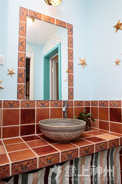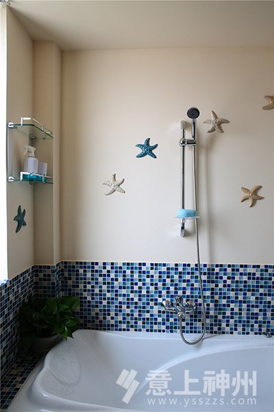在洗手間的墻壁上,用小海星粘貼在墻上作為裝飾,滿滿的都是大海的氣息。